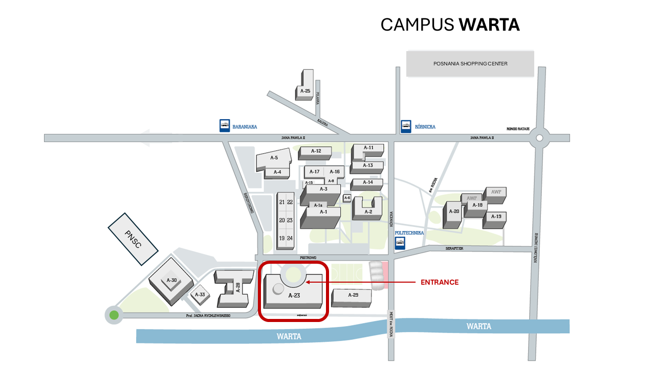 The campus is accessible from major roads including Hetmańska and Piotrowo streets. Public parking is a paid parking. If you are a participant, let us know - we will let you into the PUT parking.
